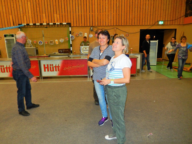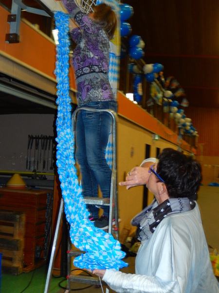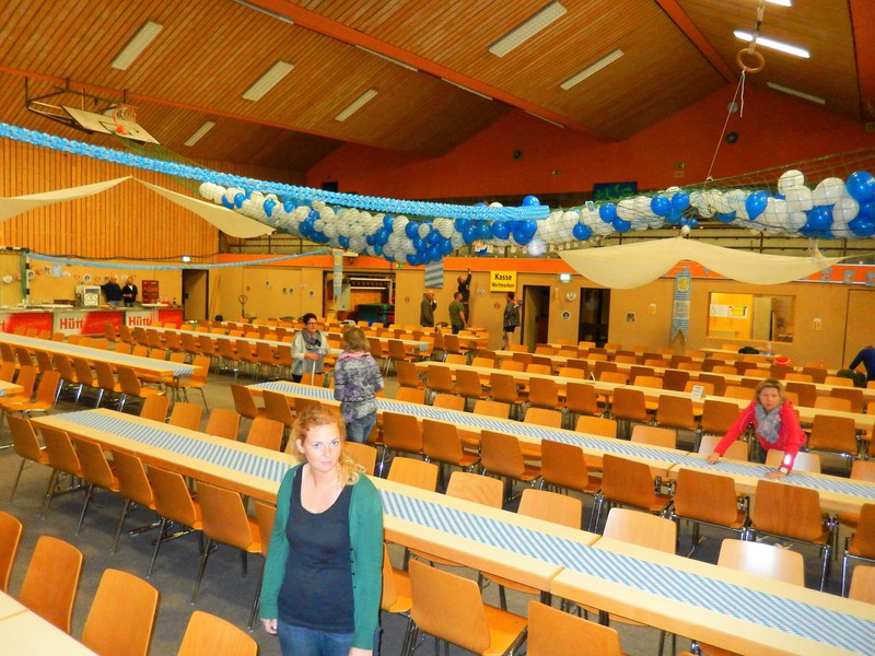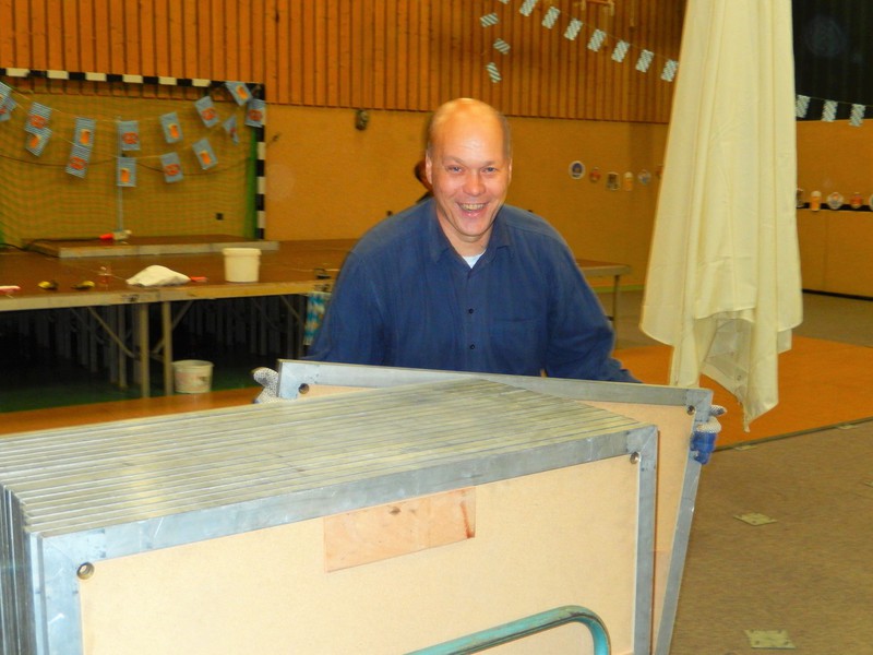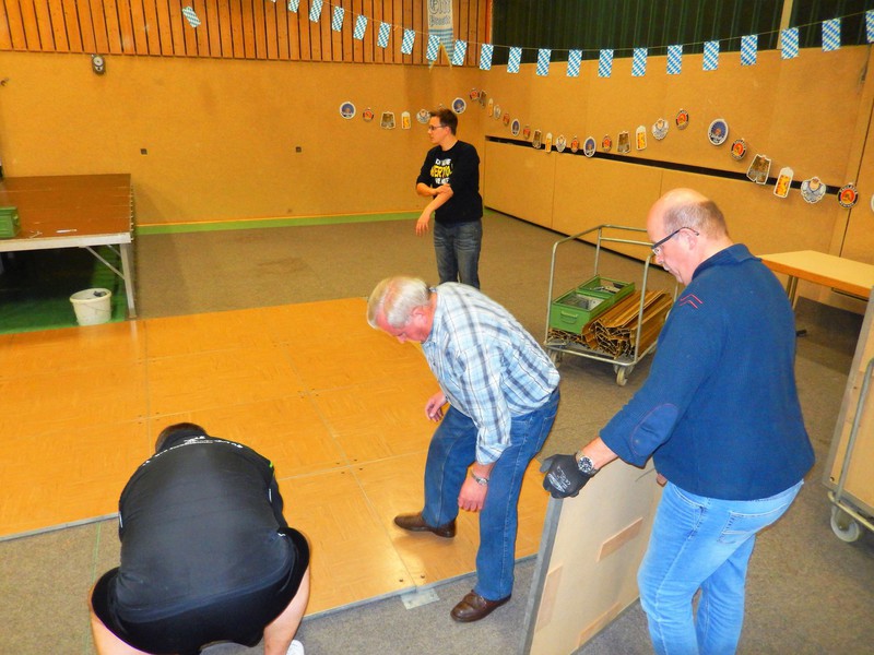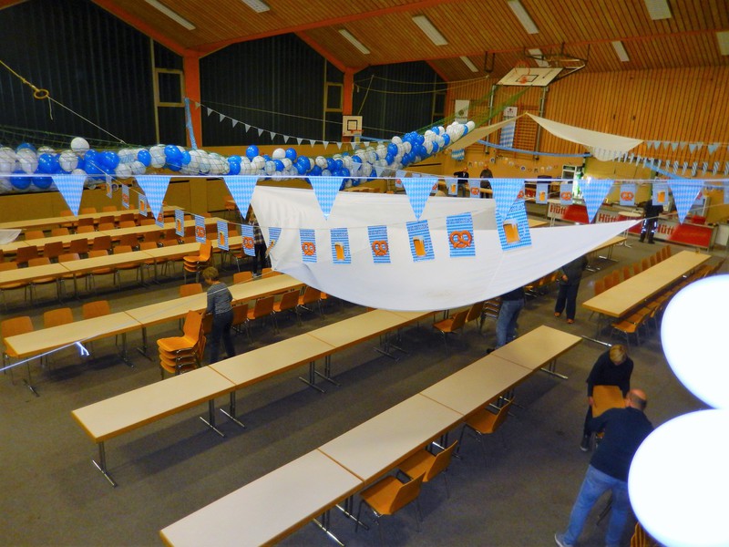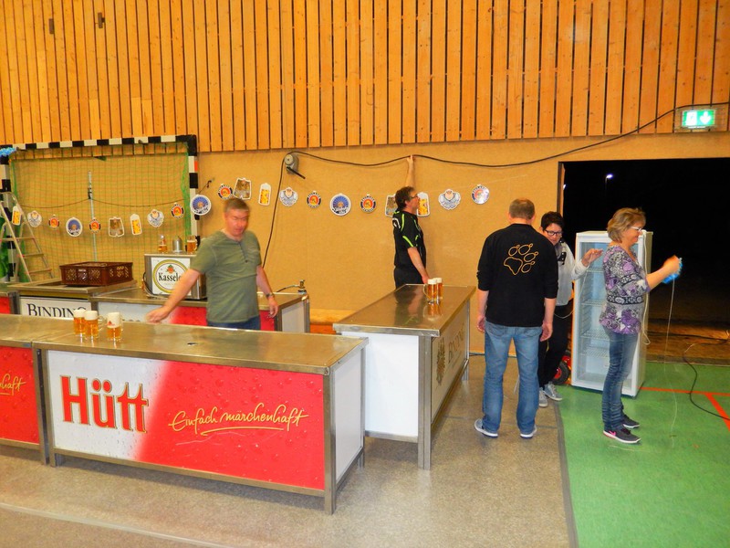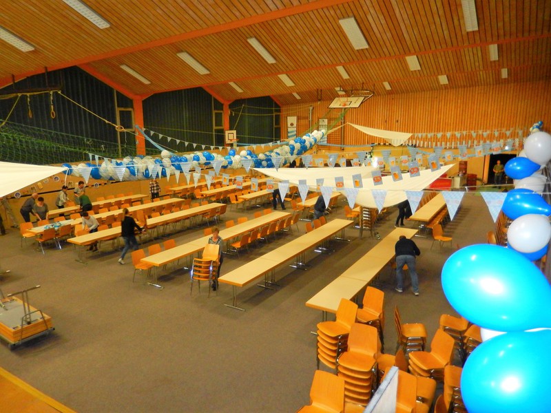 Bereits am Freitagabend waren über 30 Personen damit beschäftigt, die Halle auszulegen, Tische und Stühle zu stellen, die Thekenanlage aufzubauen (und zu testen), Strom- und Wasserleitungen zu verlegen. Der Festausschuss hatte sich eine tolle Dekoration zurecht gelegt, die angebracht werden musste und so war man bis spät in die Nacht beschäftigt. Am Samstag morgen ging es dann um 09.30 Uhr wieder los. Material musste von Vereinsheim in die Halle geschafft werden, die Dekoration abgeschlossen werden und die letzten Handgriffe und Tests wurden durchgeführt.