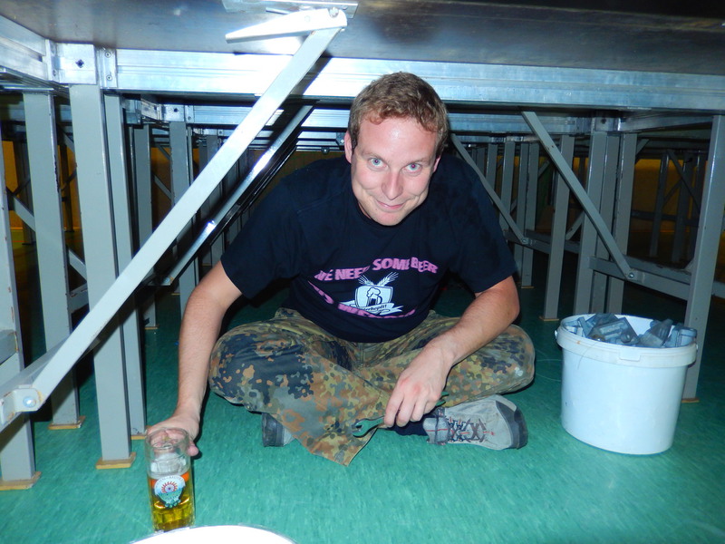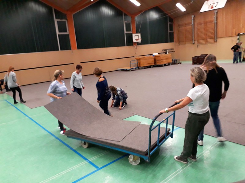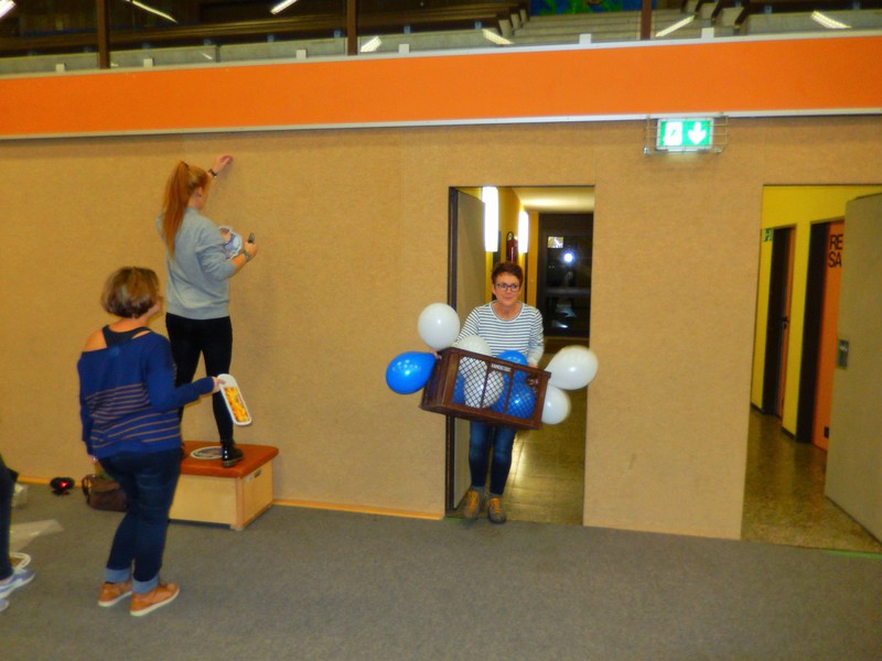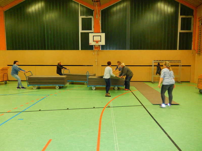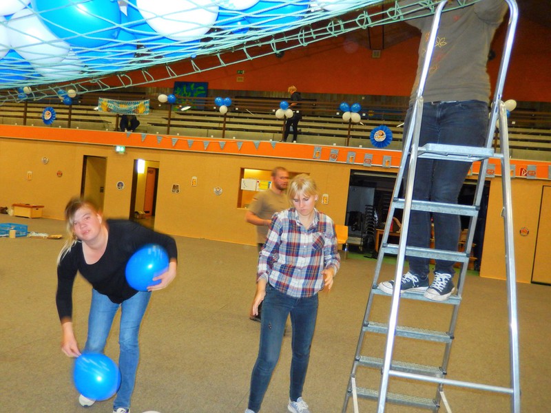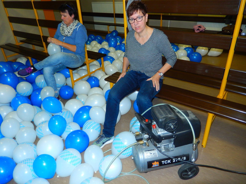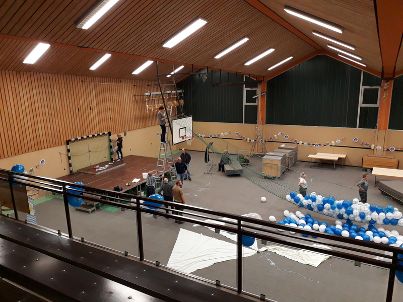 Bereits am Freitagabend waren über 30 Personen damit beschäftigt, die Halle auszulegen, Tische und Stühle zu stellen, die Thekenanlage aufzubauen (und zu testen), Strom- und Wasserleitungen zu verlegen. Der Festausschuss hatte sich eine tolle Dekoration zurecht gelegt, die angebracht werden musste und so war man bis spät in die Nacht beschäftigt. Am Samstag morgen ging es dann um 09.30 Uhr wieder los. Material musste von Vereinsheim in die Halle geschafft werden, die Dekoration abgeschlossen werden und die letzten Handgriffe und Tests wurden durchgeführt.