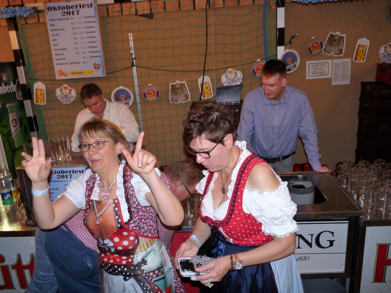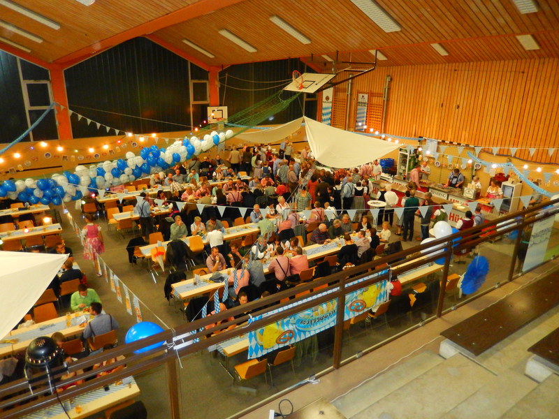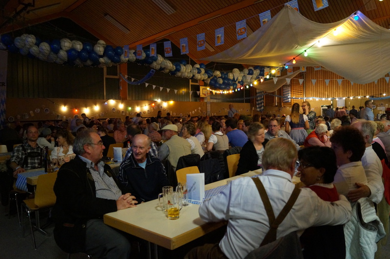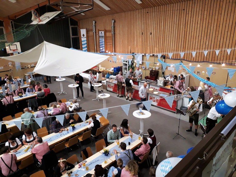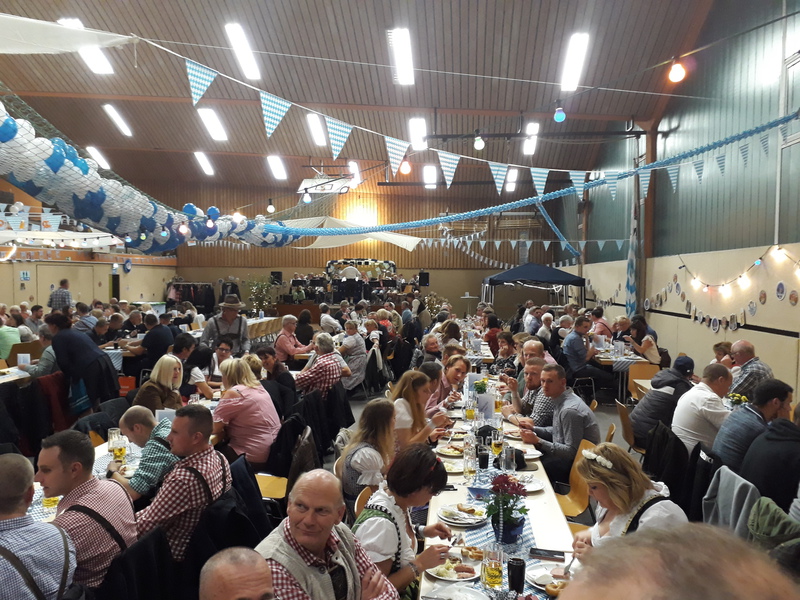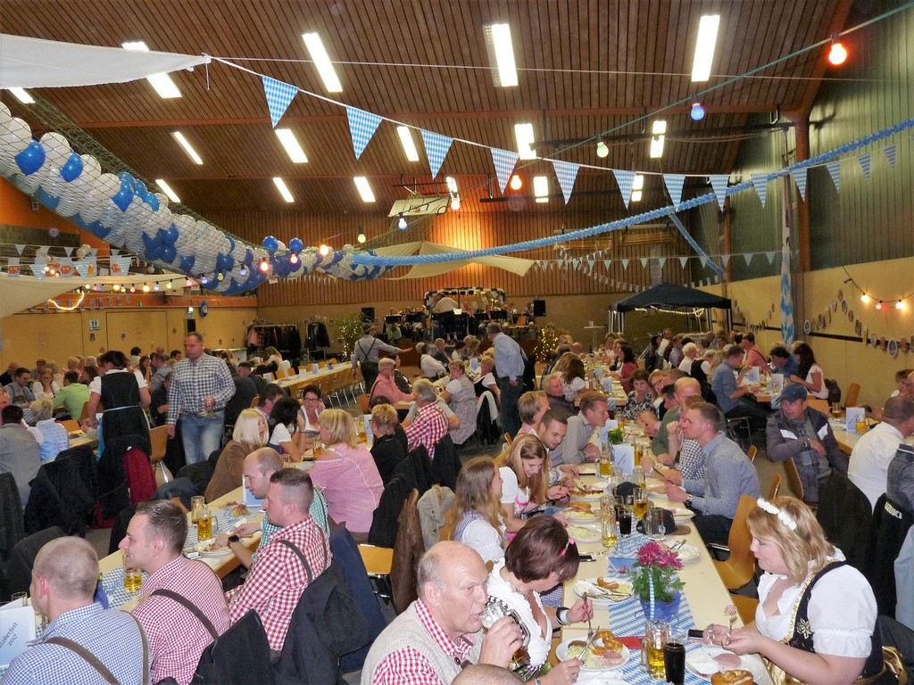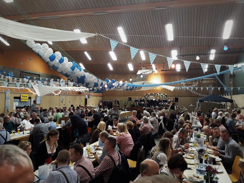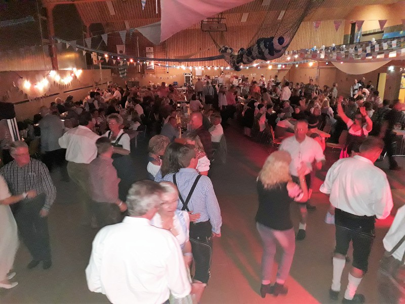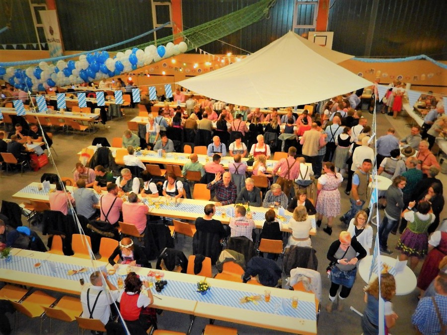 „Im ganzen Dorf habe ich gestern nur Dirndl und Lederhosen gesehen!“ Dies waren die Worte der Lieferantin, als sie am Sonntagmorgen ihre Utensilien abholte. Und genau so war es gefühlt auch. Dass unser Angebot eines Oktoberfestes so gut angenommen würde, hätte sich der Vorstand wahrlich nicht träumen lassen. Hatten wir bei der ersten Planung noch Überlegungen angestellt, wie man die Halle ggf. optisch etwa verkleinern könne, zeichnete sich einige Tage vor der Veranstaltung ab, dass man sich eher um mehr Plätze, Essen und Getränke etc. kümmern musste.