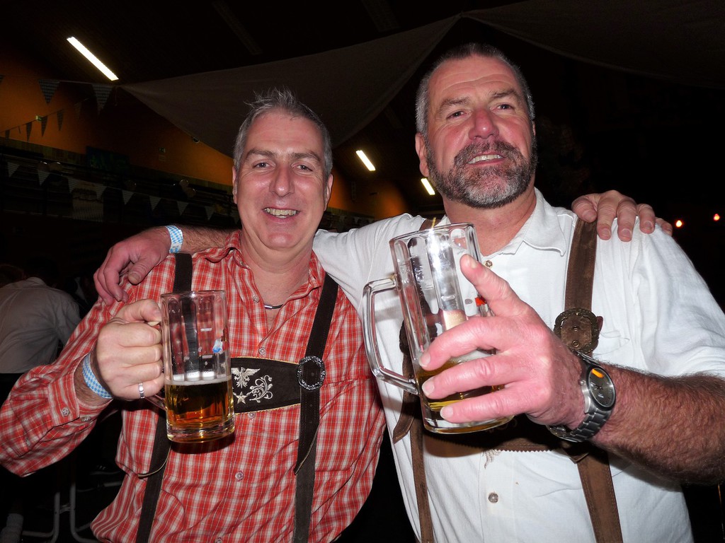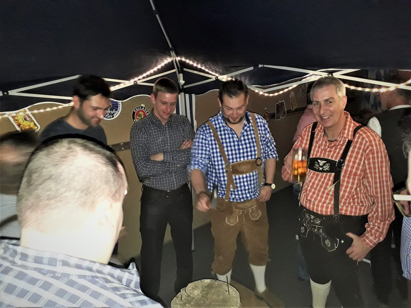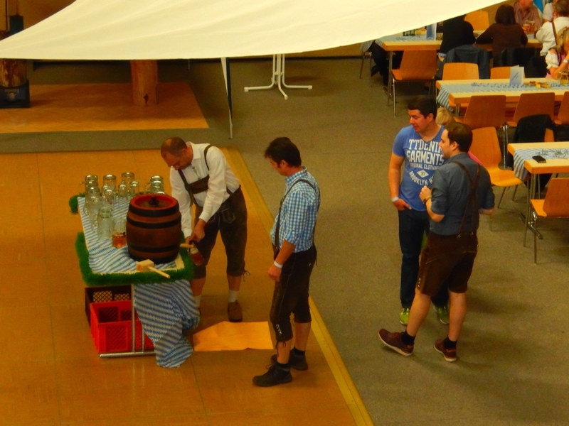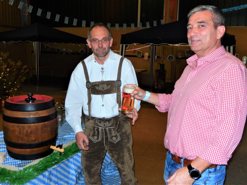 Vorstandsmitglied Mario Schirmer begrüßte die zahlreichen Gäste und zeigte sich über die vielen Besucher und die dem Anlass entsprechende Kleidung erfreut. Michael Dworog und Andreas Kiehne nahmen dann den offiziellen Fassbieranstich vor und nach einigen Schlägen sprudelte das erste Oktoberfestbier in die Masskrüge.